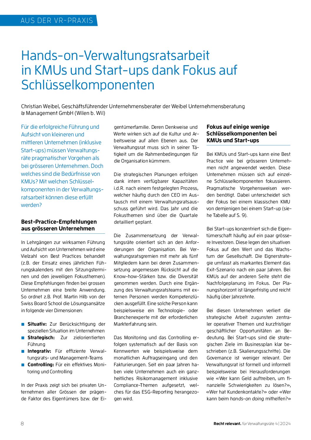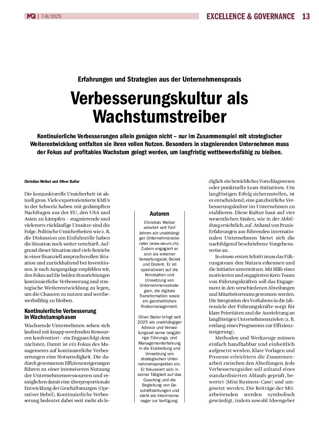 Insights Publications and News Verbesserungskultur als Wachstumstreiber Juli – August 2025, MQ Management und Qualität Read now Hands-on-Verwaltungsratsarbeit in KMUs und Start-ups dank Fokus auf Schlüsselkomponenten 4│2024, Recht relevant. für Verwaltungsräte Read now Weiterentwicklung bei der Digitalisierung von Geschäftsprozessen Januar – Februar 2024, MQ Management und Qualität Read now Erfolgsfaktoren bei der familienexternen Nachfolgelösung October 2023, ERFOLG Read now How can we help you? Expert Opinions Risk Management Digitalizations Management Alle Services Interested and ready for the next step? Start now!